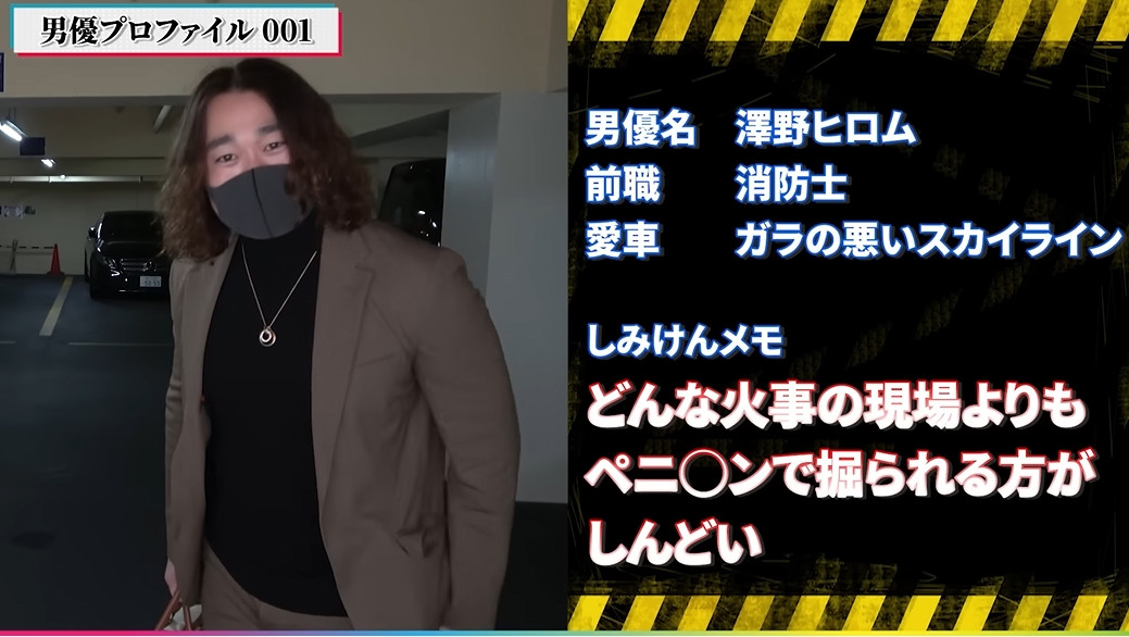 所以不要以为他只是三上悠亜的御用男优,他是每个女优的钟点情人:至于这位男优是何来历呢?影片中的图片显示他过去曾是消防员,后来因为性趣使然开始用下半身讨生活并且在6年前升格成了业界的一线男优ーしみけん(清水健)对他的评价是「车子是很没品味的Skyline」,然后还告诉大家对泽野ヒロム(泽野大梦)来说「比起任何火灾现场」、「被人家拿假阳具捅(屁眼)感觉更加辛苦」: