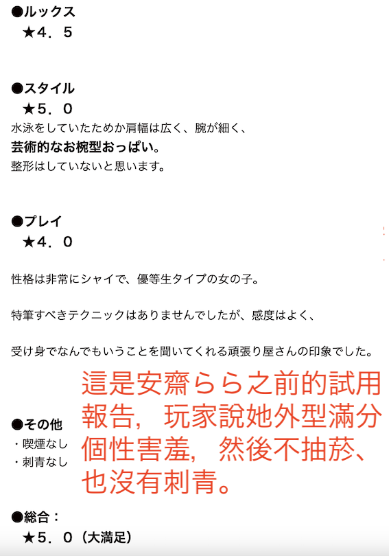 所以现在只有一个方法,就是这几天就找个人杀过去等她出勤就预约出来看看是不是本人,我坦白说,虽然资料上的价格很便宜(90分钟70,000円,折合台币16,000元左右),但一般我所知道的AV女优价格就真的差不多那样,也就是说不要因为身价不符合我们对安斋的想像就觉得那一定不是她,尤其如果你有在看女优风俗情报的话就会发现2015年的时候就有人写过安斋的试用报告,留言还有人扼腕说当时没喝到这杯又香又浓的奶奶奶奶奶奶奶荼: