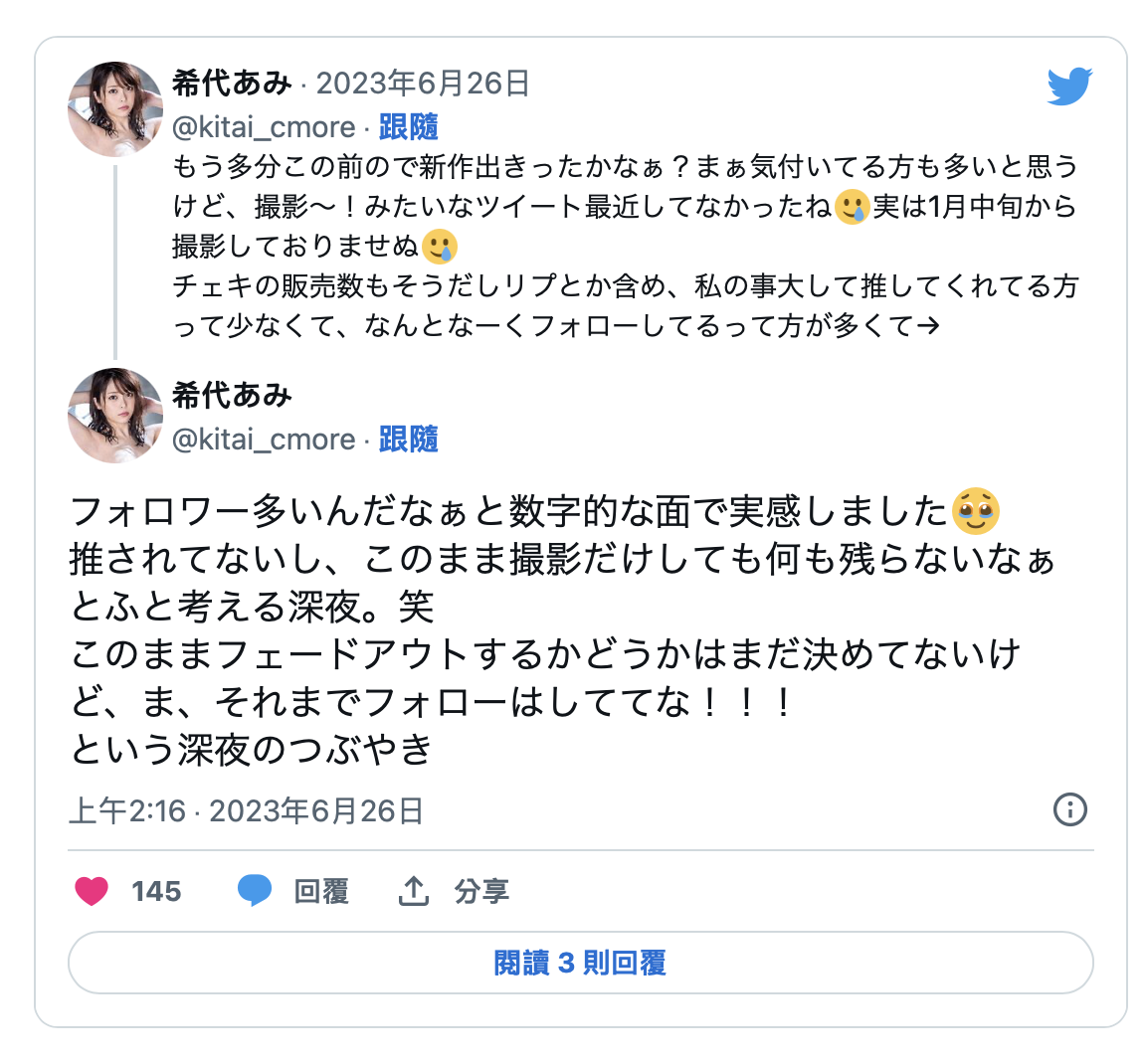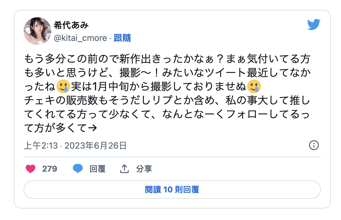 有关这点,事务所的答案是除了片商的邀约变少外,希代あみ(希代亚美)本身也有些状况,但事务所并没有放弃她,还是有在帮她找工作;不过希代あみ(希代亚美)自己也说了,虽然twitter追踪的数字不少(超过14万),但其实她的周边产品销售不好,每次发文的回覆也不是很多,每到夜深人静,都觉得似乎没什么影迷是真的很喜欢自己: