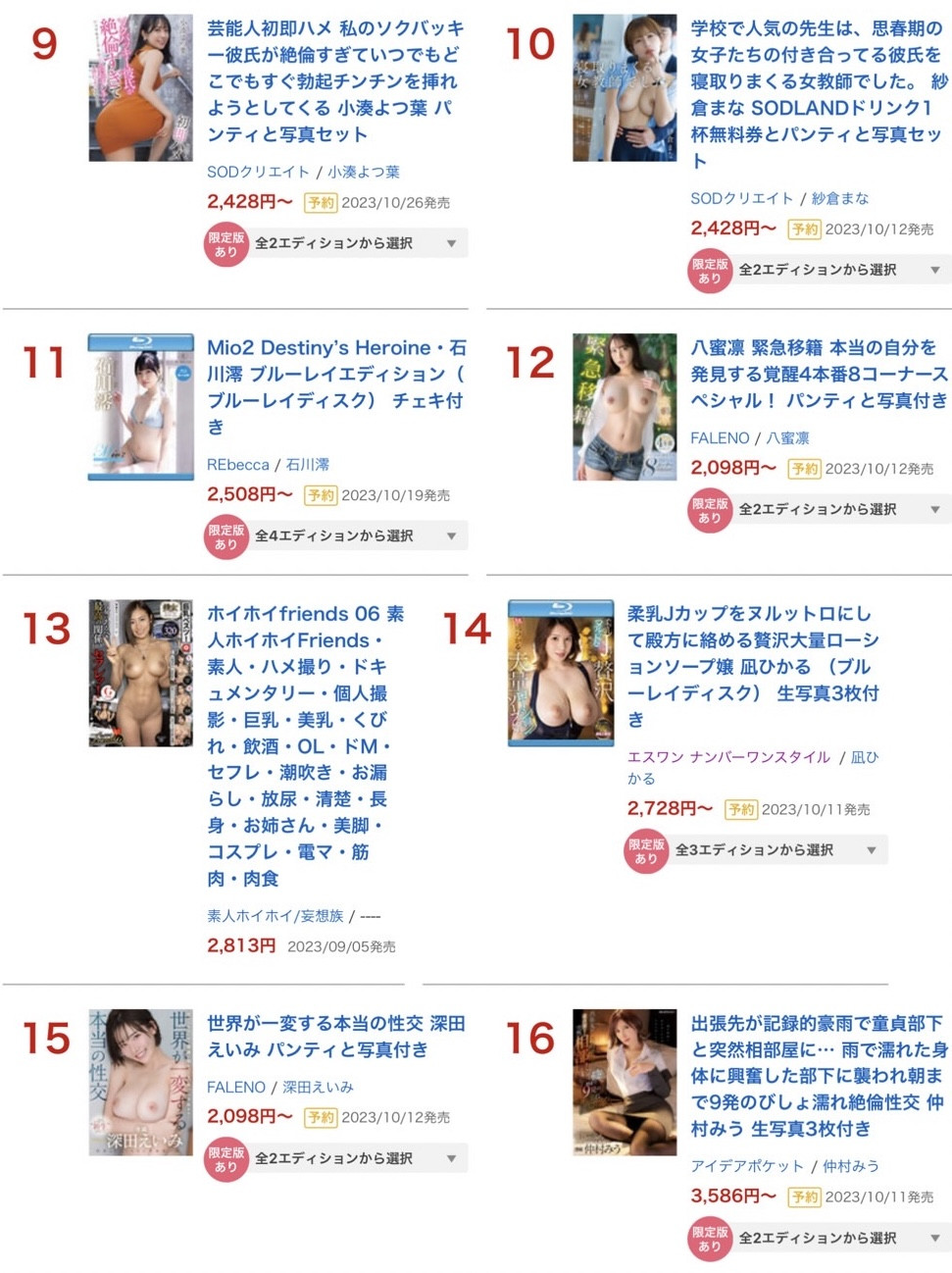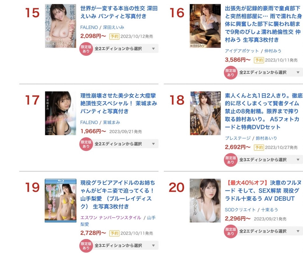 这次的销售排行榜很重要,因为是三上悠亜引退后的第一次销售排行榜,我们都知道花河北彩很卖、片商S1有很多新鲜的肉体然后SOD Star组成了艺能人军团,究竟~谁是2023年9月的销售排行榜冠军呢?