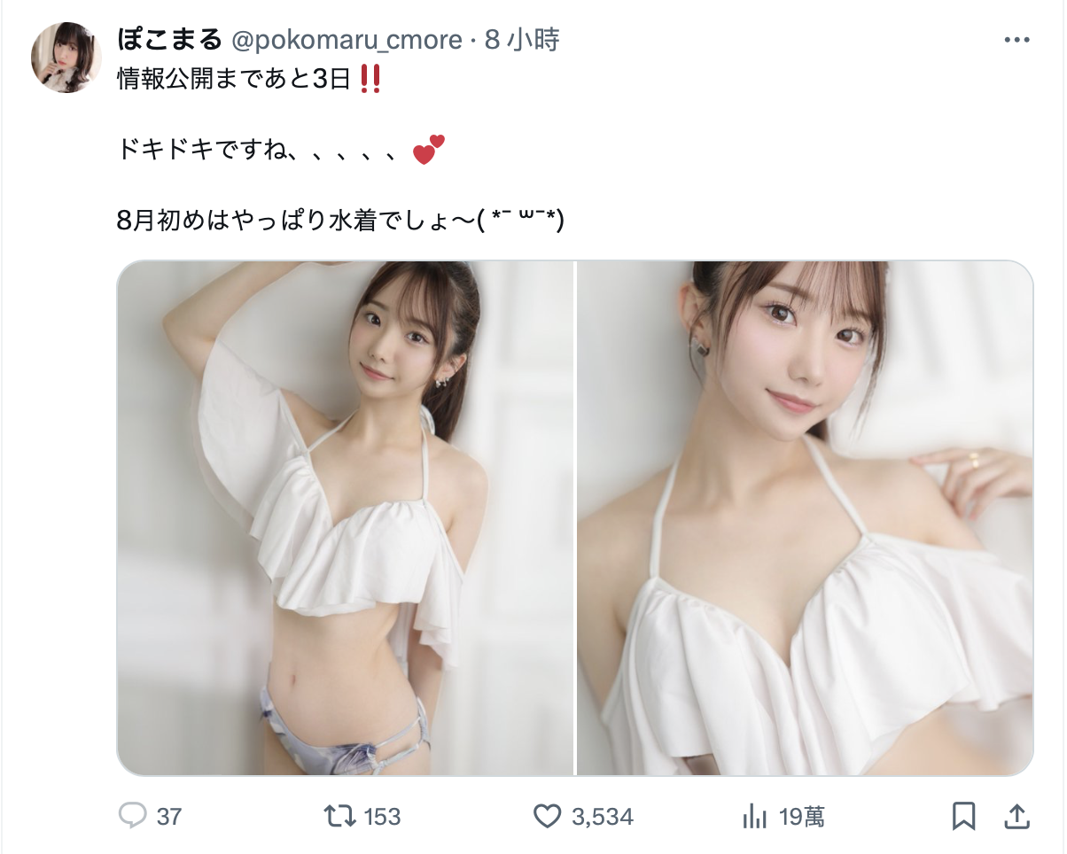 昨天,她是在X(https://x.com/pokomaru_cmore)宣布再过三天就要情报公开,假如礼拜四不算的话就是会在星期天公布答案,而这几乎就是明示她会在哪一家片商现身了ー