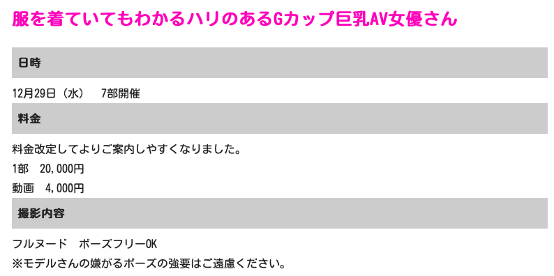 她只有木下一半的价格(20000円,5000台币),而且可以フルヌード(全裸)、然后ボーズフリーOK(Pose Free OK),也就是说除非你叫她学空条承太郎做一些违反人体工学的姿势或是一些会让人觉得很噁烂的动作不然你要她怎麼做都行,由於现在女优下马的比例远不如从前,所以参加这样的摄影会就可以让你成為少数看过女优鲍鲍还用照片纪录下的性运儿,爽啦!