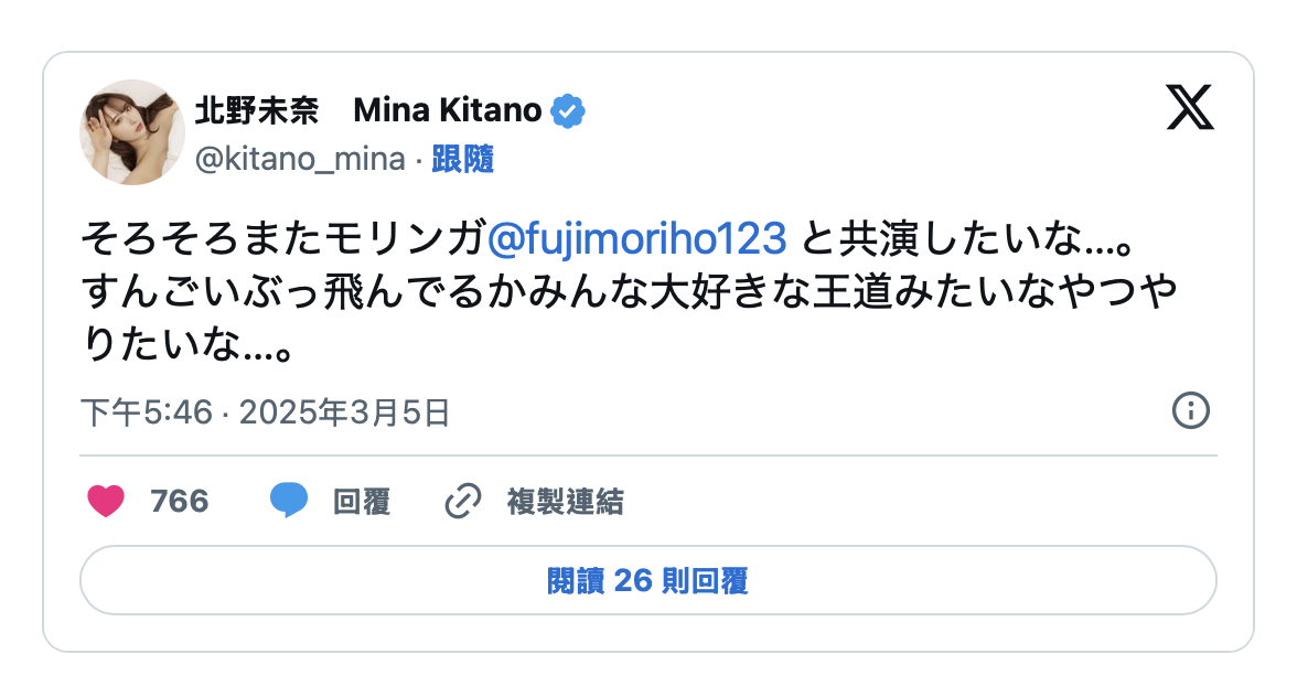 前两天北野未奈在自己的X(https://x.com/kitano_mina)发文说想和藤森里穂共演,想要挑战超级疯狂的作品,不然演一些王道的作品也不错,你猜藤森里穂怎么回应?