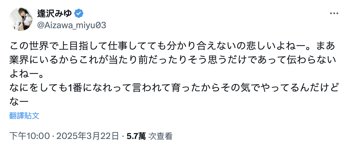 以粉丝的观点,还是希望逢沢みゆ(逢泽美优)撑住啦,毕竟离开出道专属的片商S1然后换到一家没问题的经纪公司后现在的她可是入行以来的最高峰,社群的人气和作品的买气都证明了有愈来愈多人喜欢她,在FANZA(DMM)的排名也说明了这几个月她的发展有多么出色ー我是认为她已经成功了,接下来就努力保持下去,不管是发片的力道以及对粉丝的宠爱,当然,也希望有机会能在台湾再看到她〜
