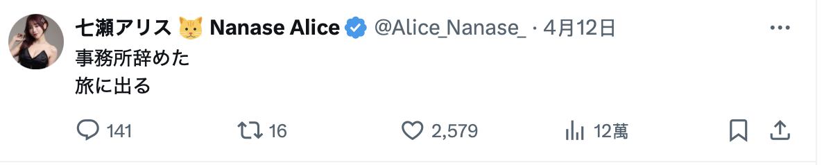七濑爱丽丝(七濑爱丽丝)是在自己的X(https://x.com/Alice_Nanase_)这么写的:「我辞职了,要去旅行了。」