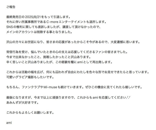 在抛弃原有艺名并要求大家追踪自己的新帐号(https://x.com/ami__t1010)后,时田亜美(时田亚美)终于发表声明说明一切,8月21日,最后的作品发表后她被引退了: