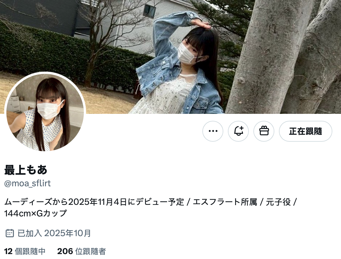 因为最上もあ(最上萌爱)有社群(https://x.com/moa_sflirt)呢:这代表她和AV界应该不是露水姻缘,而是有意思长期发展,虽然不在Moodyz未来的蓝图内(因为她是FRESH系列,通常是一片合作),但如果是我,那肯定第一片不给你看,第二片再请她摘口罩给大家看个清楚〜