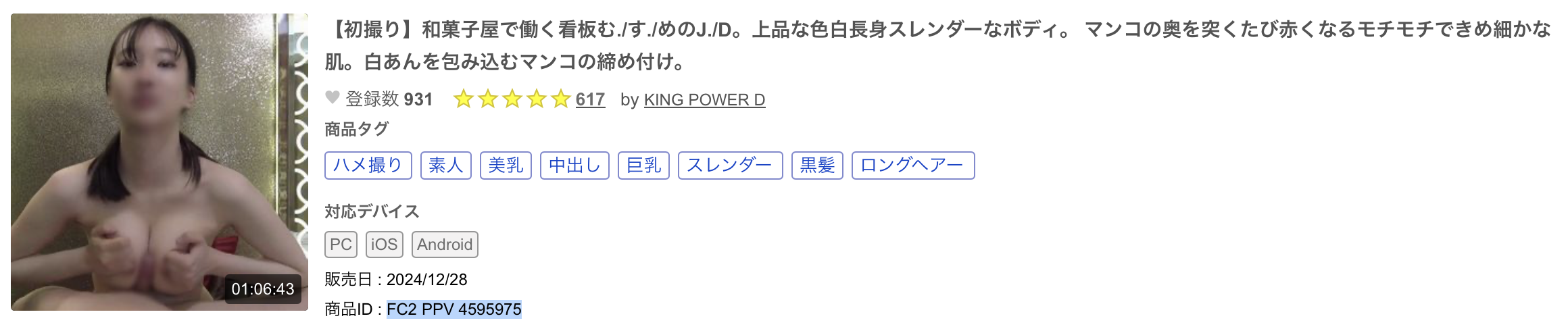 所以接下来她成了FC2平台最抢手的素人女优、和不少卖家密切合作:比较著名的是以「瀬名彩音」的名字拍了一系列的作品,不过因为有打马赛克在这里我就不附上番号了;然后FC2-PPV-4610374的「邻部屋かのんちゃん」是她、FC2-PPV-4595975那位在甜点店上班的大学生也是她,一直到今年暑假她都在FC2平台有作品产出,不只拍得很多而且作品发得很频繁,应该是大家都认识的女优了:
