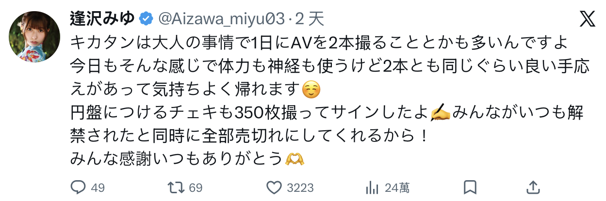 首先这是她两天前的发文,逢沢みゆ(逢泽美优)说企画女优一天拍两支作品是常有的事,然后当天她就是一口气拍了两片ー这个让我来说明一下,一天拍两支作品大多不会是发行DVD的长片(也就是120分钟的作品),大多会是串流的短片(作品大概65~80分钟左右、只能线上播放或下载,不会DVD化),这样来看当然是短片比较轻松,但也因为这样,所以事务所会在征求女优同意后安排一天拍摄两支作品的行程⋯