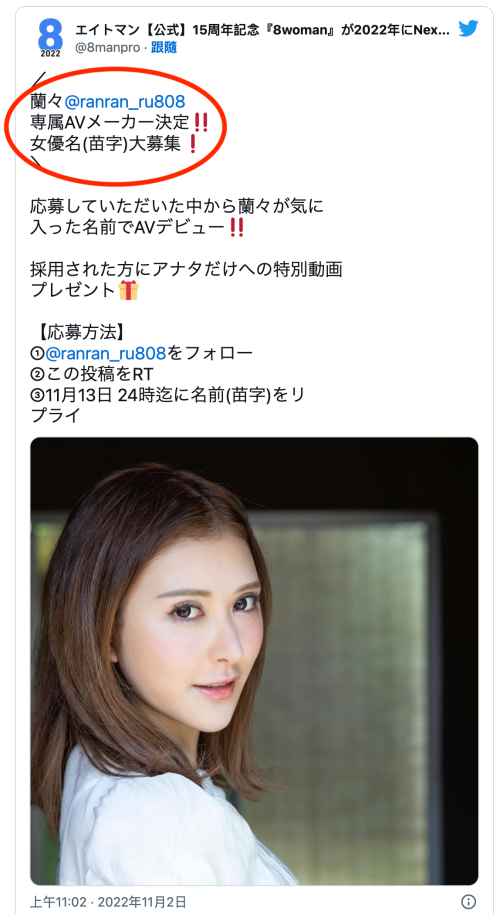 在官推上,8MAN宣布答案了,兰々、専属メーカー决定(专属片商确定了)!