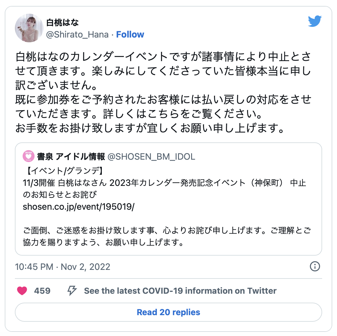 其实看她之前写的道歉声明就知道不太对劲,除了政治人物外我很少看到有人是用自己的名字当自称,所以白桃はな(白桃花)发文的第一句竟然是「白桃はなのカレンダーイベントですが诸事情により中止とさせて顶きます(白桃花的日历活动因为诸多事情取消)」怎么看是怎么怪,感觉就像⋯有人代替白桃はな(白桃花)发的文〜