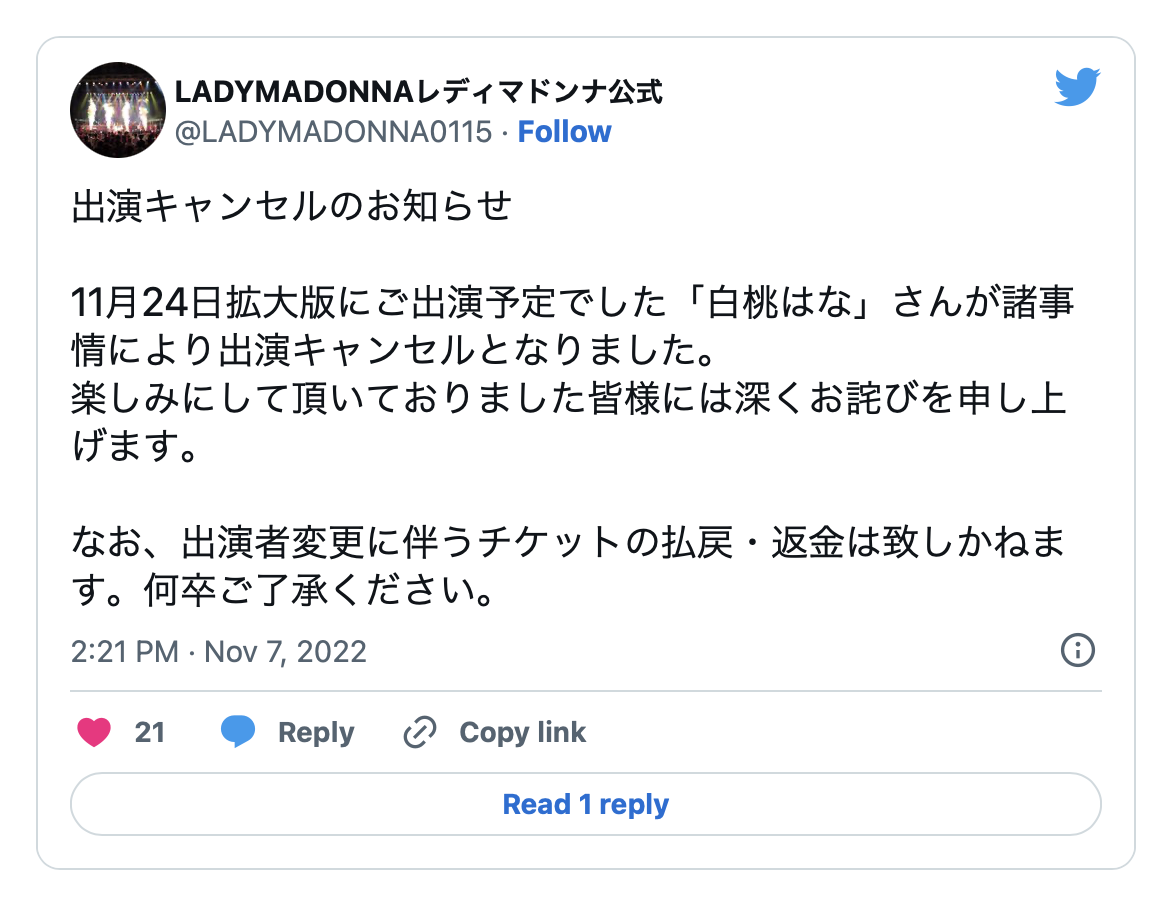 她怎么了呢?首先是活动大量取消,先是11月3日的2023年日历见面会她以「因为诸多事情(就是我也不想解释啦)」为由缺席活动,虽然有发表道歉声明但之后预定要在11月24日举行的Lady Madonna演唱会她也宣告不出席了,如果是生病那她铁定病得厉害知道两个星期后无法康复,如果不是生病嘛⋯