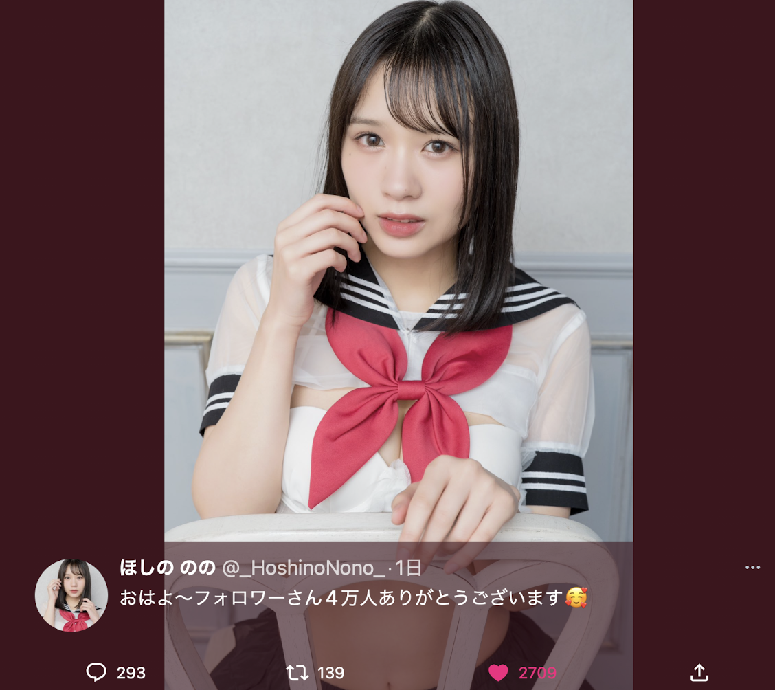 昨天,ほしののの(原小仓七海)非常开心地宣布新的twitter帐号已经突破四万人了。