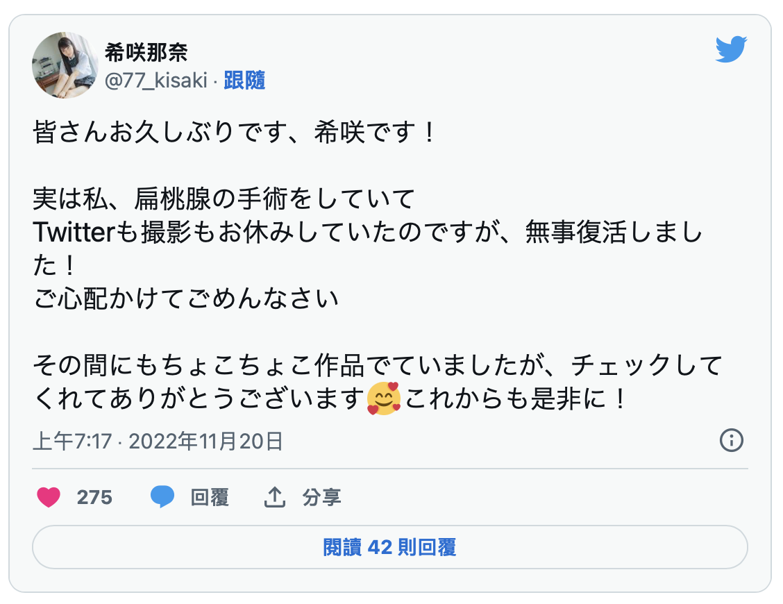 她说了,是因为扁桃腺手术的原因,所以没拍片子也暂停更新twitter,现在她身体已经康复了,之前拍的片子也陆续上市,请大家多多支持〜
